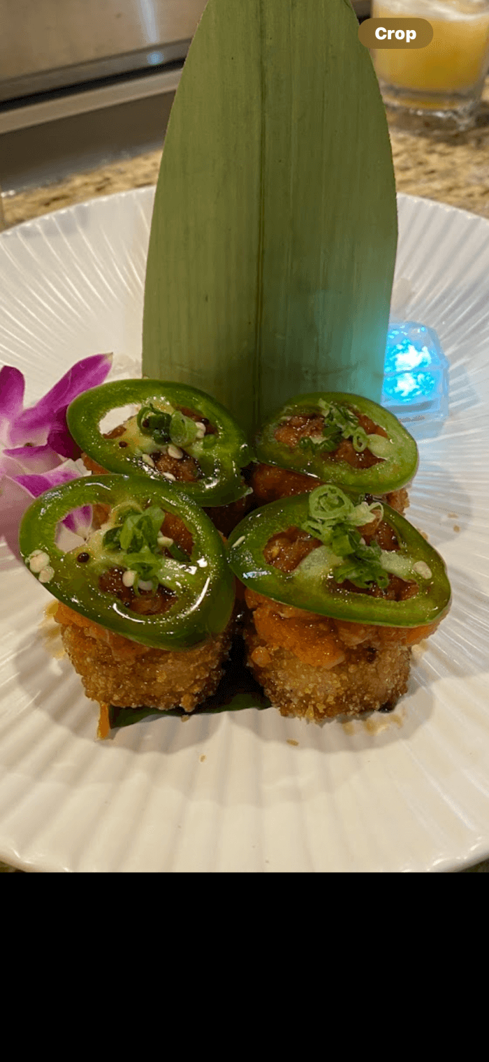Crispy rice topped with spicy tuna, green onions, jalapeño and Japanese dressing
